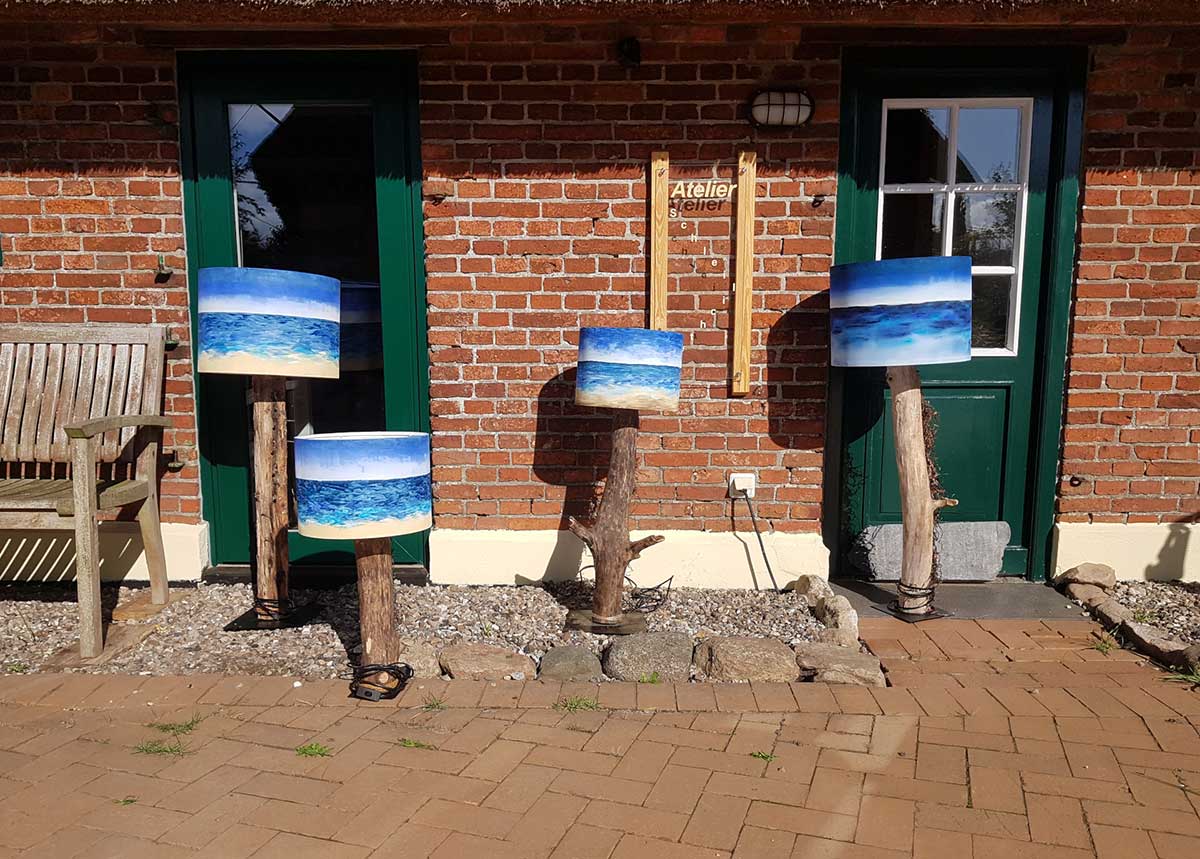 So dient mir mancher Strandgutfund von angeschwemmtem Holz dazu, Holzskulpturen und Holzlampen zu bauen. Auf den handbemalten und bedruckten Schirmen der Lampen werden Farben und Licht zum Strahlen gebracht.